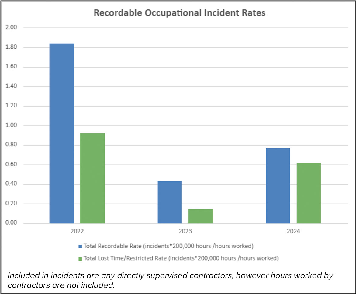 We compare against the total recordable rate (TRR) for our industry (NAICS) and seek to perform better than this benchmark. Our industry has been between 1.6-1.8 TRR.